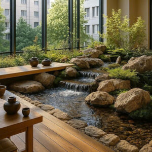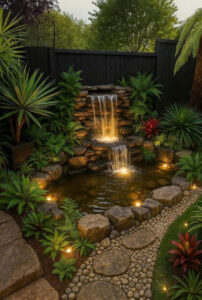 Đặc điểm: Thiết kế núi đá nhiều tầng, nước chảy từ đỉnh xuống hồ tạo âm thanh thư giãn.