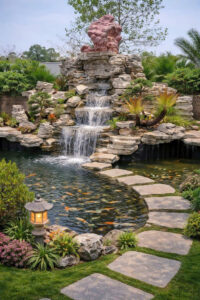 Đặc điểm: Núi đá tự nhiên kết hợp hồ cá Koi rộng, có hệ lọc nước và thác chảy tuần hoàn.